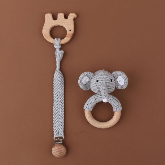 1Set Crochet Bunny Baby Teether Rattle Safe Beech Wooden Teether Ring Pacifier Clip Chain Set Newborn Mobile Gym Educational Toy
